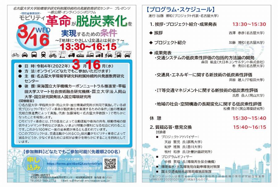 【終了】公開シンポジウム「モビリティ革命が脱炭素化を実現するための条件 ~『地球にやさしい』交通とは何か?~」(主催:名古屋大学大学院環境学研究科 附属持続的共発展教育研究センター)
