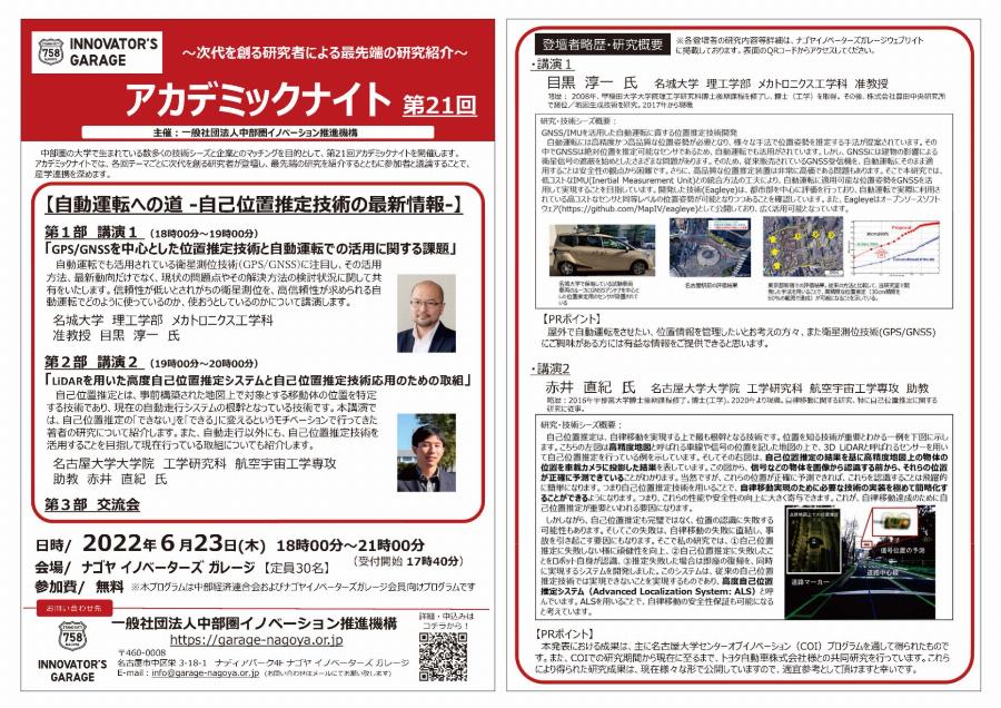 一般社団法人中部圏イノベーション推進機構が主催する「第21回 アカデミックナイト」に、目黒淳一 客員准教授(名城大学 理工学部)と、赤井直紀 助教(先進ビークル研究部門)が登壇します。