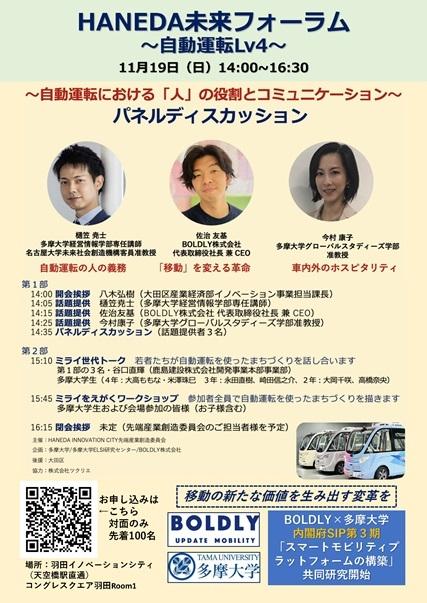 羽田イノベーションシティで自動運転の定常運行を実施するBOLDLY社から佐治友基氏、多摩大学から法・倫理の専門家である樋笠尭士専任講師と、元ANA総合研究所のホスピタリティ研究で知られる今村康子准教授が、自動運転の人の役割についてクロストークをします。