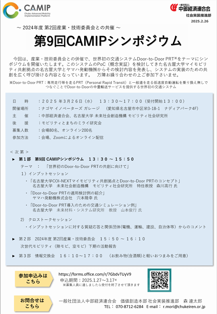 【終了】第9回 CAMIP(中部先進モビリティ実装プラットフォーム)シンポジウム ~世界初のDoor-to-Door PRTの共創に向けて~